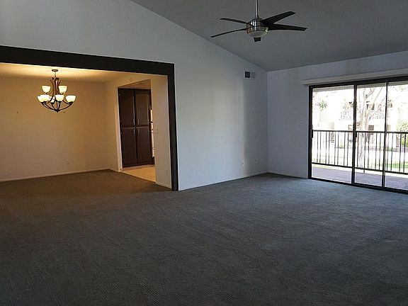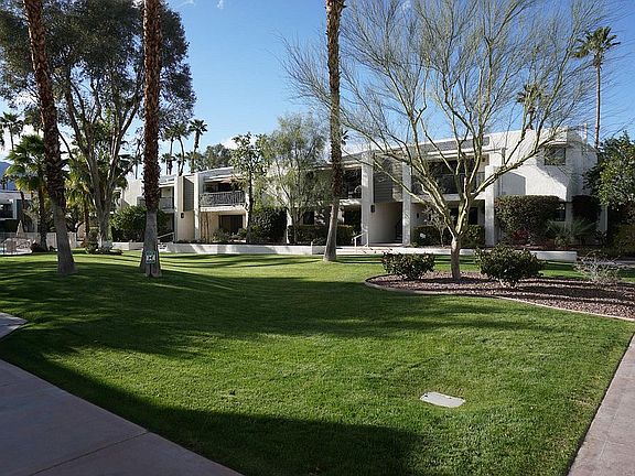 Amazing two bedroom, two bathroom second floor condo in Palm Springs' gated Palm Villas community. Featuring vaulted ceilings with fans, new carpet, interior laundry room with full sized washer and dryer, two patios with green belt and mountain views, and a master suite with a dual basin vanity and large closet with built-ins. Covered parking. Small pet OK subject to owner's approval, $25 pet rent and $100 deposit. Offered at $1500 per month on an annual lease. Please call the property manager at 760-895-1430 for more information or to schedule an appointment. Annual