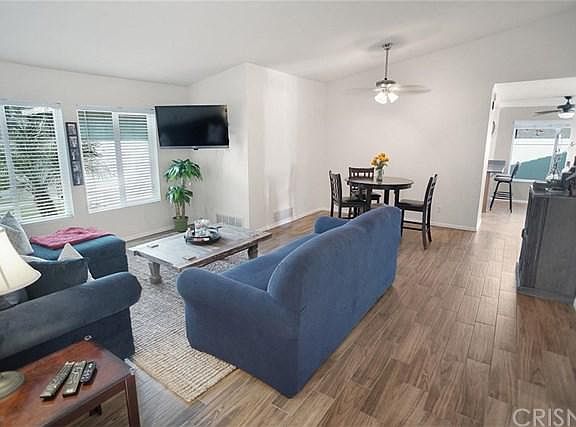 Upgraded Single Story Meadowood Home in Castaic! NO HOA, NO MELLO ROOS - 3 Bedroom, 2 Bathroom 1385 Sq. Ft. Drought Resistant Front Yard and Stone Accents on the Home's Facade for Lots of Curb Appeal! Wood Look Tile Flooring starts at the Entry and Continues Through Most of Home. Formal Living Room with Vaulted Ceiling is Open to the Dining Room, Perfect for Entertaining! Updated Kitchen with Tile Flooring, Corian Counters, Gas Range, Microwave, Recessed Lights and Newer Cabinets including Lazy Susan and Pantry. Kitchen is Open to the Family Room with Recessed Lights, Cozy Fireplace and Sliding Glass Doors to the Patio. Master Bedroom with Wood Tile Flooring, Walk-In Closet and Sliding Glass Doors to the Backyard. Two Additional Bedrooms, Both with Wood Tile Flooring and Ceiling Fans, & Additional Full Guest Bathroom are Located off the Hallway. Backyard with Drought Resistant, Easy Maintenance Turf, Vinyl Fencing, Paving Stones and Covered Patio. So Many Amenities: Newer Kitchen, Newer Bathrooms, Newer Heating and Cooling System, Newer Windows and Doors, No Carpeting, Smooth Ceilings. Laundry is Located in the 2-Car Garage. Dont Miss This One!