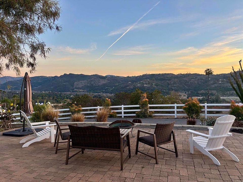 Sweeping panoramic views and peaceful countryside living await at this private, gated, single-story home nestled in the hills of Bonsall. The property offers expansive vistas of Moody Creek Horse Farm and the Hialeah Hills, with views that stretch far beyond, creating an unmatched sense of space, beauty, and tranquility. Set on just under 1.7 fully fenced acres, this hilltop sanctuary captures stunning sunsets and exceptional privacy, with few neighbors in sight. The home features three spacious bedrooms and two and a half bathrooms, including a newly remodeled primary suite bathroom. Inside, hardwood floors flow throughout open, sun-filled living spaces. The living room showcases mountain views, and the dining area opens to a covered patio through sliding glass doors, perfect for seamless indoor-outdoor living. Outdoors, enjoy a wraparound driveway with ample parking, a covered side patio for evening dinners, and a front patio ideal for morning coffee and sunrise views. The backyard features a newly landscaped grassy area and an elevated view patio. There are numerous spaces to relax, entertain, or consider adding a pool or ADU. The property includes just the right number of avocado and citrus trees for personal use, easy to care for yet productive. A truly special Bonsall retreat, this home offers the best of Southern California countryside living, tranquil, scenic, and move-in ready, with endless potential for the future.