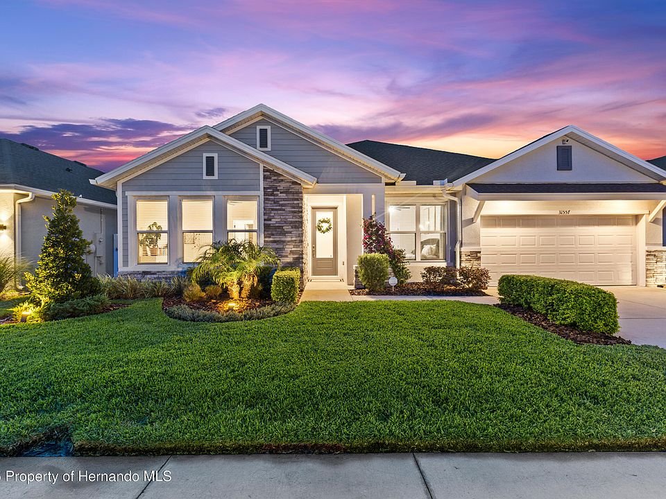 Welcome to this extensively upgraded Palmer model by David Weekley Homes offering over 3,000 square feet of thoughtfully designed living space, featuring 4 bedrooms, 3 full bathrooms, RARE 4 CAR GARAGE, a dedicated study/office, & TV room all set on a premium lot with upgraded elevation and stacked stone front. Reimagined and enhanced this home now showcases more than 100,000 in upgrades, making it a standout in the community. Step inside and you're immediately greeted by soaring ceilings, elegant sight lines, and a 12-foot multi-panel sliding glass door that draws your eyes out to the expansive screened lanai and paver patio. The heart of the home features a gourmet kitchen with quartz countertops, a designer vent hood, upgraded cabinetry, a cooktop layout, full-height backsplash, and a premium double oven. The oversized island flows into an open dining and living area that is perfect for both entertaining and everyday living. The Owner's Suite offers a spa-like retreat with a super shower, upgraded custom closet system, and premium flooring. Secondary bedrooms have also been enhanced with custom closet upgrades, and two beautifully improved guest baths add even more function and style. Additional upgrades include eight premium ceiling fans, upgraded chandeliers and lighting fixtures, window blinds and custom drapery, upper cabinetry in the laundry room, and board and batten accent walls in the foyer and children's room. A premium Titan water softener system and EV charging station offer convenience and efficiency, while the fully fenced backyard, enclosed with aluminum and PVC fencing is ideal for privacy and pets. The backyard also features a garbage can enclosure, extended pavers along the side yard, and a Brand new 40,000 dollar full screen enclosure covering the entire extended back patio, all completed in 2025. This home is truly move-in ready, with every major upgrade already completed, included on a premium lot with upgraded elevation, quartz throughout, and high-end appliance package. Located in a vibrant resort-style community featuring a lazy river, dog parks, playgrounds, clubhouse, fitness center, and walking trails, and just minutes from top-rated schools, Wiregrass shopping, Tampa Premium Outlets, and famous man-made lagoons at Mirada and Epperson. This is more than a home, it's a fully upgraded lifestyle property, meticulously maintained and elevated to a level rarely seen in today's market.