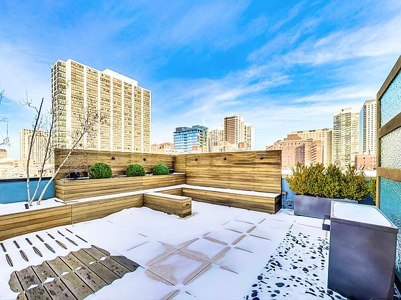 Lakeview 3br/2ba TOP floor, ENTIRE ROOFDECK is exclusive to unit w/2 other outdoor spaces in unit. ATTACHED GARAGE. No expense spared. Newer, all brick building. Sellers remodeled as if new development; 2 zone surround sound inside & roof, new doors & hardware throughout. Spiral staircase with skylight and window from interior to roofdeck. Several new Euro style windows. 100% new hardwood throughout with blown insulation & cork underlayment. DESIGN to BUILD kitchen - 100% new, hand crafted cabinets (NOT PAINTED), honed quartz, added pot filler, touchless faucet, under & below mounted lighting, beverage fridge & dual zone wine fridge, Viking gas stove & fridge. Kitchen open to living room with new fireplace w/gas starter and floor-to-ceiling tiled wall. Large balcony with plantation shutters off of living room. Primary bedroom with huge deck, double electrical blinds (one privacy & one black out), en-suite bathroom w/floating dual sinks, modern shower w/3/4 panel glass, private toilet room, heated floors, wall of organized cabinetry w/pocket doors to customized WIC. First guest room is outfitted with Murphy bed to also double as an office equipped with double panel, electrical blinds for privacy &/or black-out and Elfa closet. Second guest room has custom office, velvet bench/lounge seating and Elfa closets. LAUNDRY ROOM with full-size side-by side front-load laundry with risers (also stackable). Roofdeck has built in seating with storage all around, pergola, waterfall wall & river rock feature, built-in concrete countertop bar with mini fridge, sink & gas line. Huge area for dining and entertaining. Also, a sun lounging area with artificial grass. Two-zone surround sound with volume options. Too many customizable features throughout the home to mention. Extra storage closet. Quiet, tree-lined street off of Belmont.