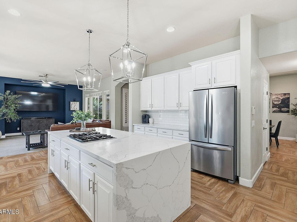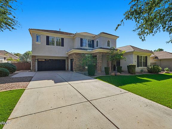 Nestled within the most desirable neighborhood in the East Valley with white picket fences, tree lined streets, and timeless charm. Higley Estates at Morrison Ranch is the ideal location to raise a family! OWNED Solar panels with integrated Tesla charger grandfathered into SRP's legacy solar rate plan through 2035! Resort style backyard designed for year-round enjoyment, featuring a heated diving pool and spa, impressive rock waterfall and slide, multiple fire-pits, travertine decking, k9 synthetic turf, & private courtyard. Inside, the gourmet kitchen was recently updated with professionally finished white cabinets and double quartz waterfall counters. Pass through the butler's pantry to expansive formal dining room outfitted with custom walk-in wine room. Main floor also features mother-in-law quarters with private HVAC and office/library with custom oak built in library shelving. Upstairs features the master suite, 3 guest rooms (all have jack and jill bathrooms) and loft that has been partially enclosed for privacy and noise reduction. Two guest bedrooms upstairs include walk in closets. Primary bedroom has enough room for full sitting area and the ensuite bathroom features multiple walk-in closets and updates throughout. Additional upgrades include a premium tankless water heater for endless hot water, a whole-home water filtration system with carbon filter, water softener, and reverse osmosis, plus full smart-home automation for the pool, thermostats, irrigation, lighting, and garage doors. The epoxy-finished three-car garage comes complete with a built-in workbench, cabinets, and storage racks, making it the ideal space for both organization and hobby use.
