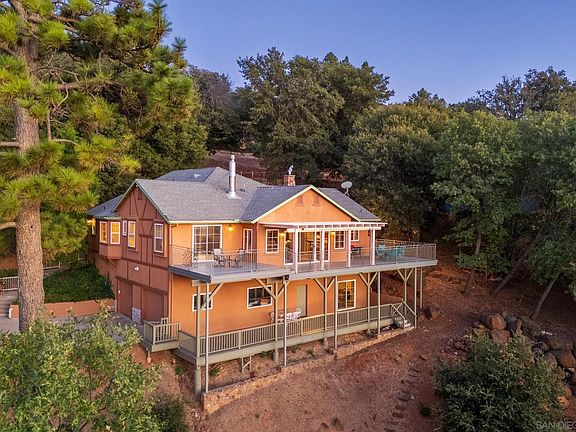 Stunning Home with Breathtaking Views! Nestled in the heart of Pine Hills, this home offers unparalleled panoramic views of Volcan Mountain, the Santa Ysabel valley, city lights as well as stunning Westerly sunsets. The 2 story home features all of your living on the main level. 3 bedrooms, 2.5 bathrooms totaling approximately 2,359 Sq. Ft. with an expansive open-plan design seamlessly integrates the living, dining, and kitchen areas, creating a perfect setting for entertaining or relaxing. High vaulted ceilings and exposed wooden beams as well as a gas fireplace and wood burning stove, add to the home's inviting ambiance. Floor-to-ceiling windows throughout allow you to enjoy the outdoors from almost every room of the home. The kitchen is thoughtfully laid out with a large island, plentiful countertop and cabinet space as well as a walk-in pantry and allows the cook to prepare meals while enjoying uninterrupted views. Evening sunsets can be enjoyed from 2 expansive decks. The spacious primary bedroom features access to the wrap-around deck, where you can savor your morning coffee while soaking in the scenery. The en-suite bathroom offers a spa-like experience with a jetted tub, walk-in shower, dual vanities with a make-up area, water closet and large walk-in closet. Downstairs is the fully finished basement with a bonus room that functions as a 4th bedroom, office, home theater or game room. Located 10 minutes from Julian’s Main St with its famous Apple Pie bakeries, shops, restaurants and wineries, this home offers the ultimate in both seclusion and accessibility.