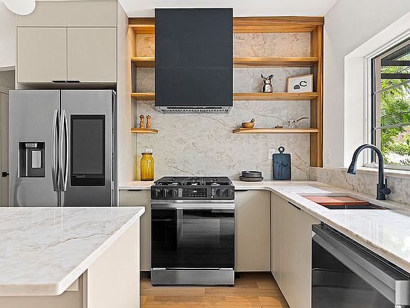 Spanning 2,056 square feet, this townhouse boasts three spacious bedrooms and two and a half bathrooms, providing ample space for family living or entertaining guests. The interior features wide plank white oak floors that enhance the home's contemporary aesthetic, while the custom kitchen cabinetry and taj mahal quartz countertops offer both elegance and durability. The kitchen is equipped with high-quality Samsung appliances, ensuring a seamless culinary experience, and includes a convenient pantry for additional storage.