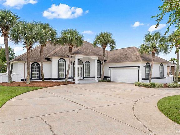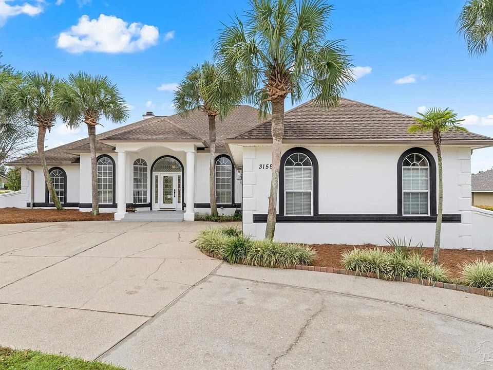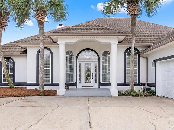 GATED GOLF COURSE COMMUNITY ~ POOL HOME ~ UPDATED KITCHEN ~ HEBLE BLOCK CONSTRUCTION WITH HARD COAT STUCCO ~ Welcome to Stonebrook. This 4BR/3BA home offers a functional split floor plan with a beautiful, backyard retreat. The circle drive, courtyard-entry garage, and covered front porch create a welcoming first impression. Inside, the foyer opens to a formal dining room with engineered hardwoods and crown molding. The family room features custom built-ins, a wood-burning fireplace with updated tile surround, and French doors leading to the pool and lanai. The kitchen has been updated with granite countertops (2025), new cooktop, island with seating, double wall ovens, tile backsplash, and pantry. The primary suite includes bamboo flooring, tray ceiling, and French doors to the lanai. The spacious ensuite bath offers two walk-in closets, dual vanities, jetted tub, separate shower, and marble tile flooring. Three additional bedrooms are well-sized, one with private access to the pool bath. The backyard is perfect for entertaining with a covered patio, recessed lighting, fire pit area, and a stucco privacy wall. Golf cart garage, attic lift system, central vac, and irrigation well are just a few of the extras. Roof scheduled to be replaced in October 2025, HVAC 2018, New Haward Energy Efficient Pool Pump installed 2024, primary bath and bedroom remodel 2025, interior repainted May 2023, exterior repainted May 2024.