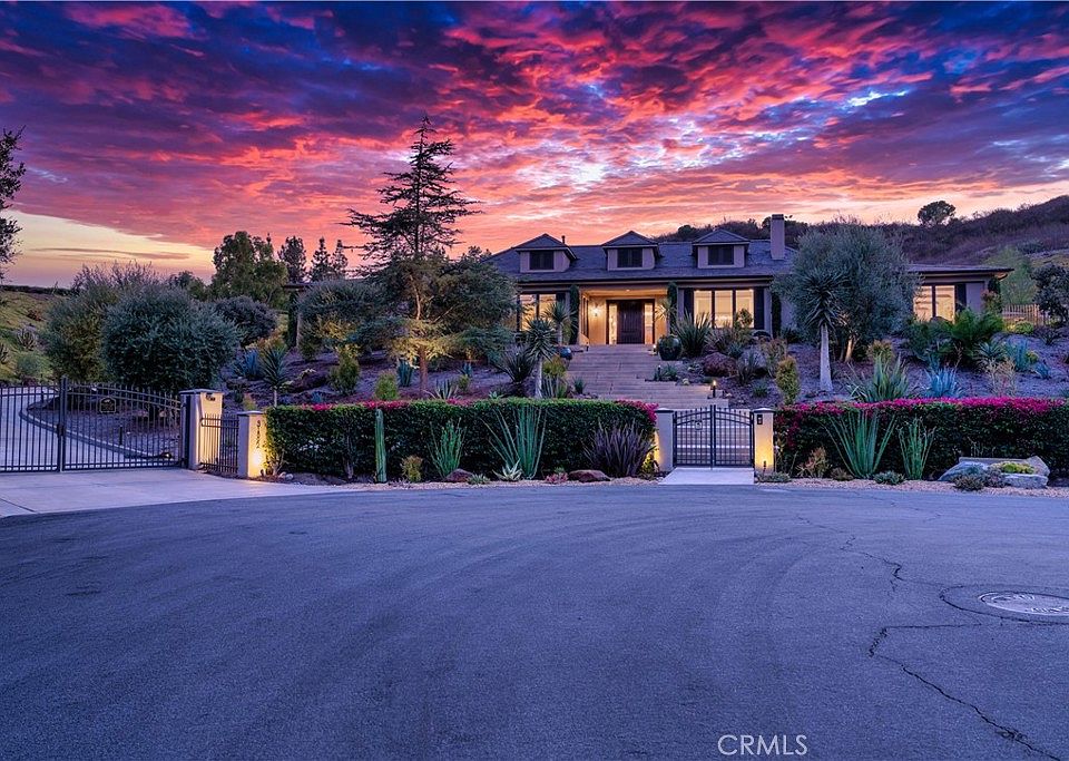 Nestled at the end of a cul de sac in the prestigious Los Ranchos Estates, this private oasis on a hilltop provides panoramic views of the Coto valley & Saddleback mountains. As you enter thru the gated drive on the side of the home, you will arrive to the secluded ranch style abode that is one w/nature. You will be greeted into a single level home by a foyer w/beautiful neutral tones, travertine floors, & plenty of wall space for your art & family photos. The formal living room has built-ins & a marble fireplace w/a raised hearth, adjacent dining room is perfect for holiday dinners. Thru an open room off the living room, currently used as a billiard room, find sweeping views of the valley & hills. The culinary style kitchen is every chef's dream w/a TECNOGAS Italian inspired range that delivers serious cooking performance & subzero size fridge along a wall of cabinets that joins other high performing appliances. The immense custom Italian granite kitchen island has space for buffet & counter seating alongside the breakfast nook w/views of the resort style outdoor space. Beamed ceilings add character to a great family room. There are 2 private wings of the home - one encompasses the primary suite w/a retreat & serene views, a private office/home gym & 2 beautiful walk in closets/rooms that have professional built-in drawers & shelves. The spa style bathroom in the primary room has a large walk in shower that doubles as a steam room w/multiple apparatuses - rain shower, jetted soaking tub, dual vanities & a make up counter. Down the corridor, there is another ensuite bedroom & a laundry room w/sink & cabinets. At the other wing, you will find a powder room, private wine cellar w/decorative wrought iron gates that open to wine racks, cabinets and shelves. 3 more ensuites complete this wing.