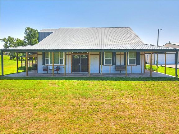 Oh Ma' Goodness!! Such great space for growing & entertaining. Just under 2 acres w/a 40x80 shop w/H&A, Office w/kitchenette, bathroom w/shower & LOTS of overhead loft storage. There is also an attached 2 car garage not included in that measurement. The home is wood frame built w/metal roof. A large living room has great flow to the kitchen where you can entertain for HOURS. Large island, SO. MUCH. storage, gorgeous granite counter top & backsplash. The open kitchen area has ample space for large dining table &/or gathering space. The primary suite boasts a large area for your king sized furniture, 2 walk-in closets, double vanity w/gorgeous granite top, jetted tub & separate tile shower. The secondary bedrooms are... you guessed!!.. very spacious as well. The guest bath has a shower/tub combo AND a free standing shower! There is also a full bath set up in the large laundry room w/lots of storage & counter space. Upstairs you'll find an open, 1344 sf bonus room. Additional amenities include storm shelter, FULL HOUSE wrap around porch, gated entry w/electric available should you choose to add an electric opener later. The house is all electric. There is a 1,000 gal propane tank on site for the shop. This is a frame home with textured concrete board outside, not steel or metal.