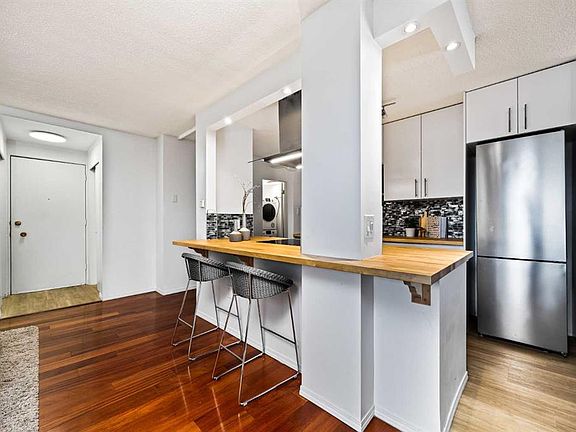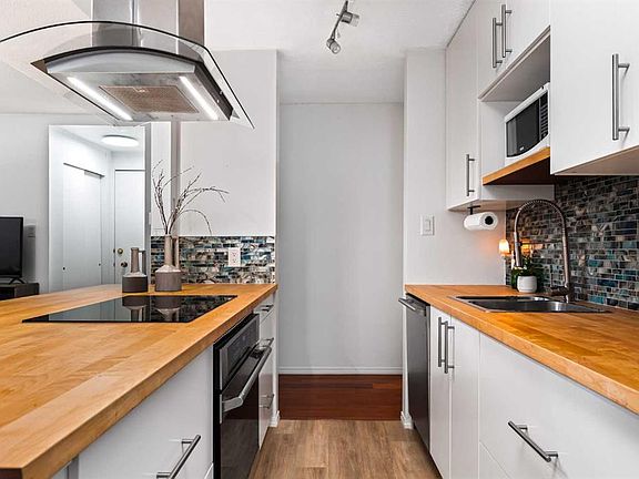 Bright first-floor homeRich hardwood flooringPrivate covered balconyModern kitchenButcher-block countersWhite cabinetryStainless steel appliances