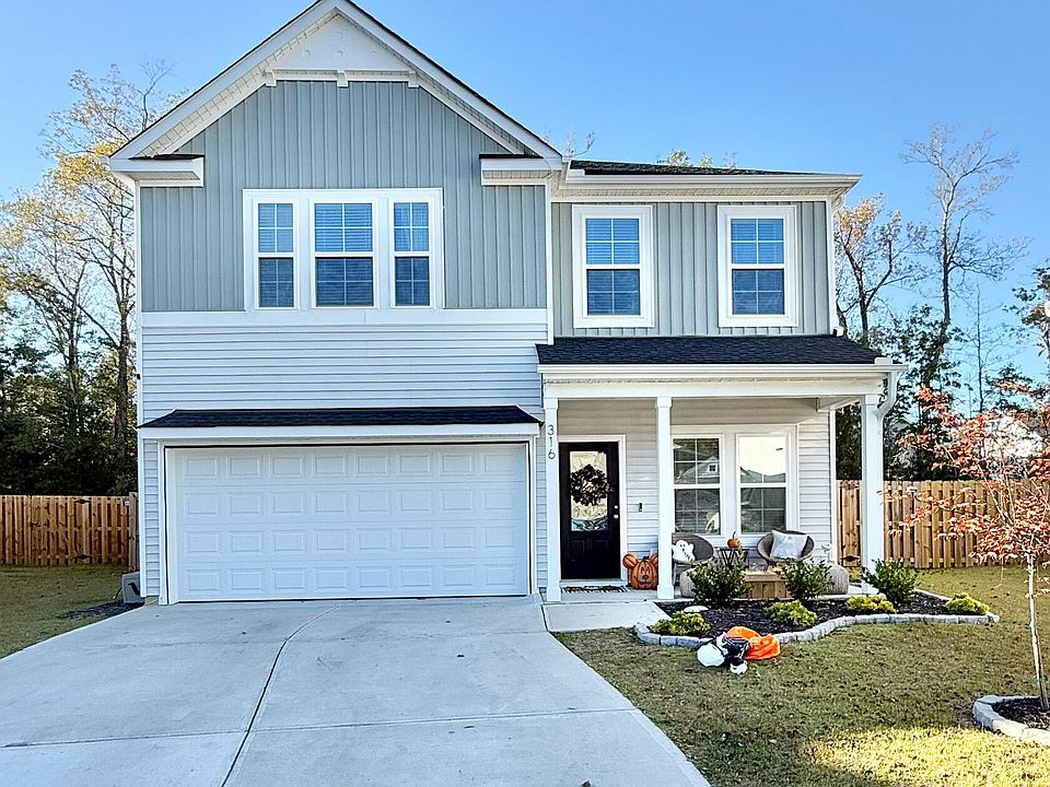 Welcome to 316 Cherry Grove Court - Your Ideal Castle Hayne Retreat tucked away in a quiet cul-de-sac in the desirable Parsons Mill Farm community, this beautiful Guilford plan offers the perfect balance of modern design, comfort, and convenience. The entryway of this four-bedroom, two-and-a-half-bathroom home opens onto a versatile flex space, ideal for a home office, playroom, or sitting area. Just beyond, the open-concept kitchen flows seamlessly into the family room, complete with an upgraded gas fireplace, making it the perfect spot for gatherings. The kitchen also features shaker-style cabinetry, a walk-in pantry, and durable LVP flooring throughout the main living areas. Step outside from the family room to enjoy a covered back porch and an upgraded outdoor patio, perfect for grilling or relaxing in the evenings. Upstairs, convenience continues with a laundry room and a full bathroom located near the three secondary bedrooms. The primary suite boasts a vaulted ceiling, a spacious walk-in closet, a linen closet, and a well-appointed en suite bathroom for added privacy and comfort. This home also features an upgraded elevation, enhancing its curb appeal and modern look. Residents of Parsons Mill Farm enjoy access to fantastic neighborhood amenities, including a community pool, sidewalks, and a friendly atmosphere, all just minutes from Wilmington's shopping, dining, and coastal attractions. Don't miss this move-in ready home in one of Castle Hayne's most sought-out communities!