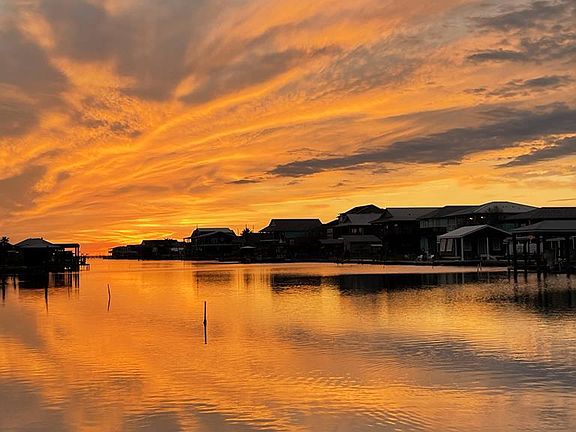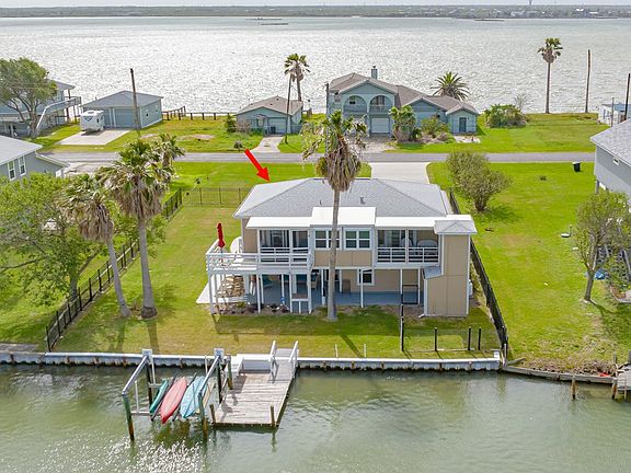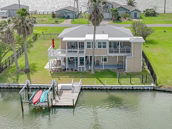 This stunning two-story home with an elevator is situated on beautiful Copano Ridge Harbor canal. With a boat dock, boat lift, fishing dock with sink, underwater fishing light, and water access to the bay. The first floor boasts a one-car garage, large carport, a charging source for electric vehicles, and a one-bedroom guest suite with a kitchen and bath. Perfect for hosting visitors, this guest suite provides privacy and comfort that your guests will love, plus access to a spacious patio and panoramic views. Upstairs, has two bedrooms and a sleeping porch, perfect for enjoying the beautiful coastal breeze. The owner's suite has an updated bathroom. The updated kitchen includes gas cooking. Enjoy the beauty of the outdoors from the comfort of screened-in porches. The property is surrounded by a fence with an electric gate. There are hurricane shutters and storm windows. From the front, find a stunning view of a lake, while the back provides views across the canal to Copano Bay.
