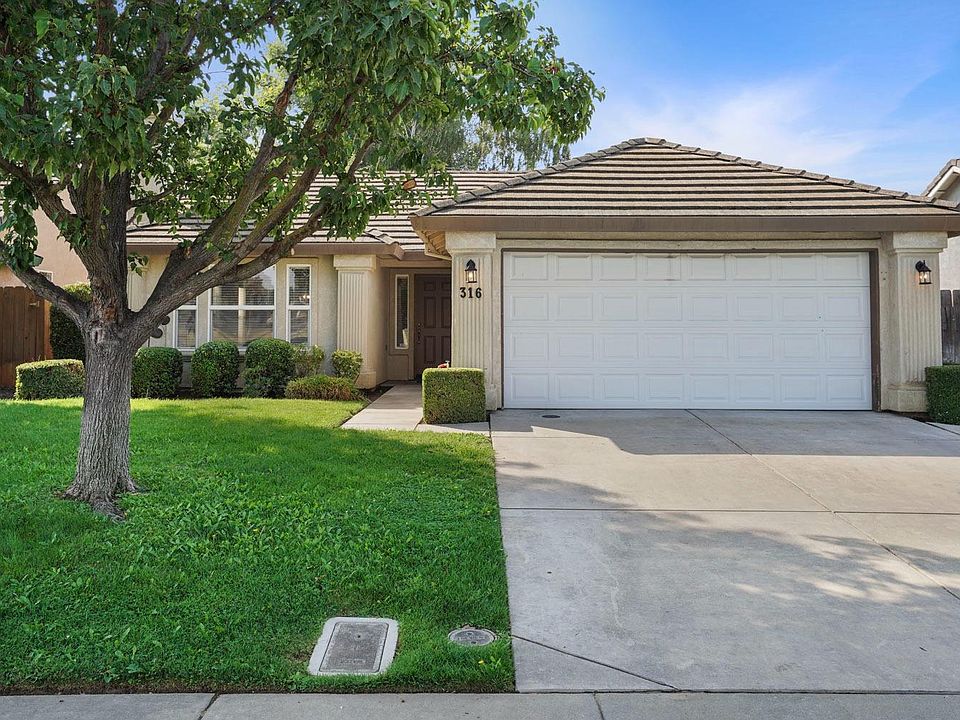 This adorable home in established neighborhood is ready for your decor style with freshly painted cabinet doors and interior walls/ceiling (and garage walls!). New light fixtures in dining/entry/bath vanities, hallway, front coach lights. New HVAC in 8/23! The great room with vaulted ceiling and fireplace is open to the dining area and kitchen. The primary bedroom with vaulted ceiling has slider to rear yard, and a walk-in closet. The primary bath has dual sinks and stall shower. Inside laundry too! Enjoy the fabulous backyard for family gatherings or just to relax. Close to shopping, restaurants and Hwy 99 for the commuter!