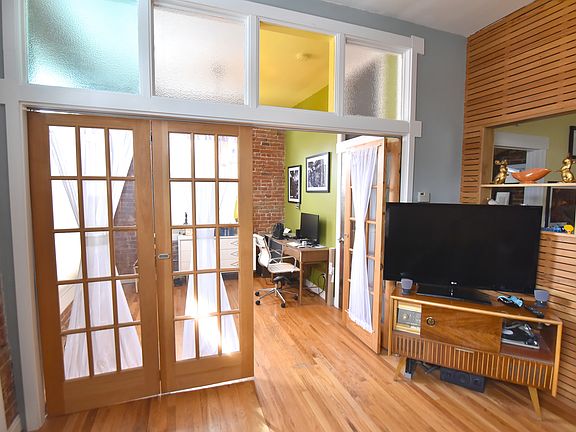 The kitchen is updated with stainless steel appliances, white subway tile, and vinyl flooring. The elegant and recently renovated bathroom has a large walk-in shower (no bathtub) and high-end finishes. The second bedroom is best suited as an office or additional living space. This room has bi-fold doors that open to living room to be utilized as an extension of the main living space / work space- but is not ideal for a private bedroom situation.