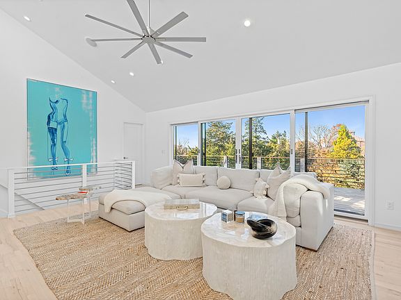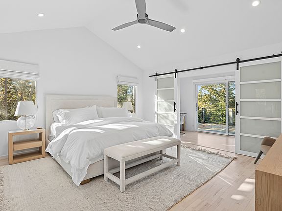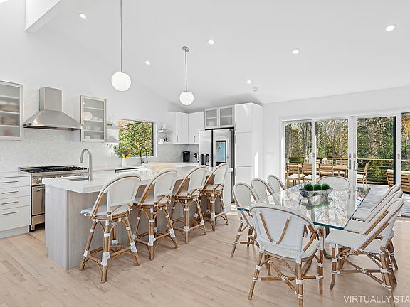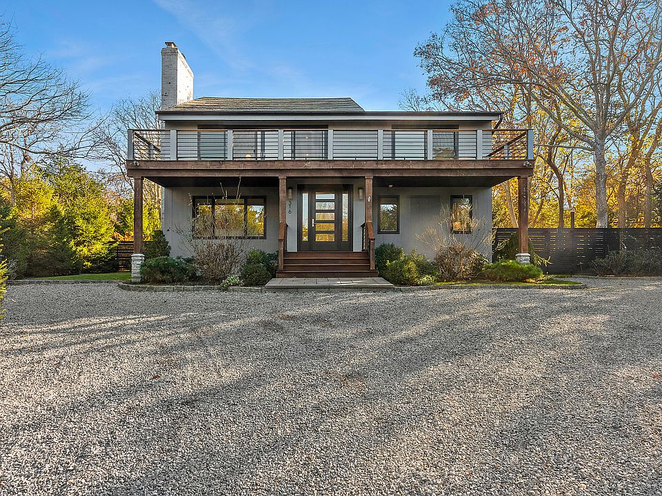 Situated on a quiet corner lot in the highly coveted Clearwater Beach community on one of the best streets in the Springs, 316 Kings Point Road is the perfect summer oasis. The two-level home boasts 2400 square feet of living space sitting on a tastefully manicured half acre plot. The first level encompasses a living room with wood burning fireplace and wet bar, three well-sized bedrooms all with en-suite bathrooms, and a powder room that connects to the backyard. The upper level of the home features a spacious and open layout with abundant sunlight, high cathedral ceilings, second living area with a second wood burning fireplace, dining area with table for 8-10 guests, an elegant updated chefs kitchen with stainless steel appliances, 8 foot island with stool seating, and a second powder room. Off of the great room is the oversized primary suite with a walk-in-closet, serene spa-like bathroom with double vanity, large shower, and oversized soaking tub, and an attached office. A fully finished basement with laundry area and media room connects to the rear yard (providing approximately 600 sf of additional interior space). There are multiple outdoor seating areas and decks surrounding the home for endless outdoor entertainment and lounging. On the ground level adjacent to the heated gunite pool there is a covered patio with outdoor shower and ample space for sunbathing. The rear upper deck has an outdoor dining table, BBQ grill, and lounge area, while the front upper deck spans the entire width of the home facing towards Gardiner's Bay with partial water views and peeks of the sunset. The entire property is bordered by tall evergreen trees and mature hydrangeas which provide the ultimate privacy. There is ample parking with a front driveway and separate side lot as well. High-end furniture, art, and luxury linens are provided. At the end of the block, just a short distance away, is a private gated marina with access to a beach with lifeguard, playground, and boat dock. You can truly live you best summer life in the Hamptons here.