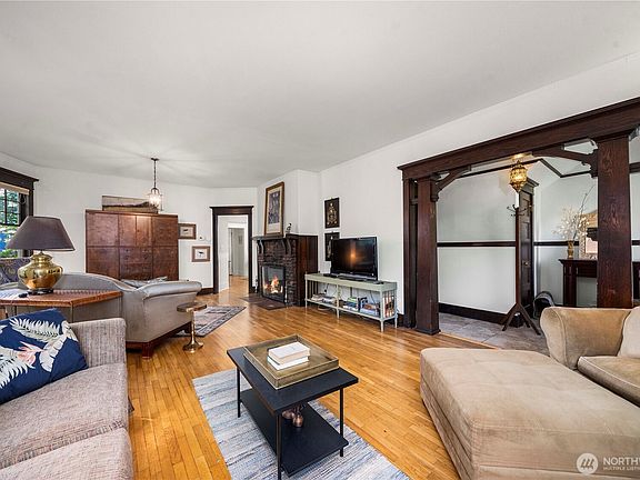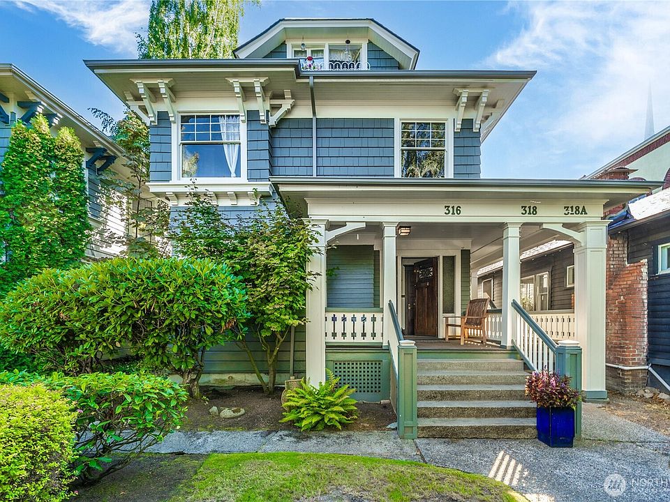 Remodeled historic slope 1910 Craftsman, This main floor unit has welcoming covered front porch, once you open your OWN front door you have a formal entry with entry closet which sets of the entry to your gorgeous, huge living room with 10ft ceilings. The large living room is large enough to accommodate a Grand Piano, not a baby Grand, a true Grand. Additionally, there is a spacious, sunfilled, dining room with large west-facing windows. The kitchen is small, but functional with ss appliances and granite counters, the private side door leads to the stairs to the basement and to the east side exterior door. Both bedrooms are large and the primary bedroom features 1/2 bath. Excellent closet/storage space, detached 1-car garage off the alley