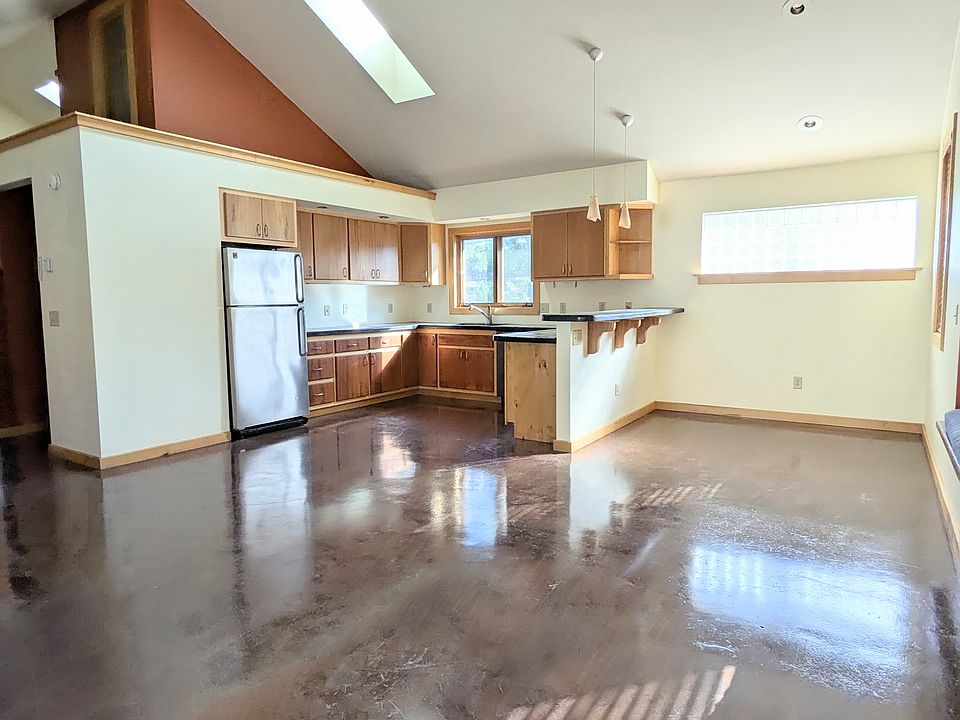 Private patio deckOverlooking the backyardTwo bathroomsDual shower headsHigh vaulted ceilingsFull kitchenBar seating
