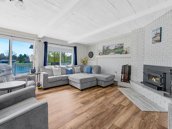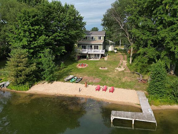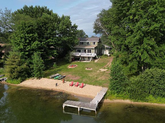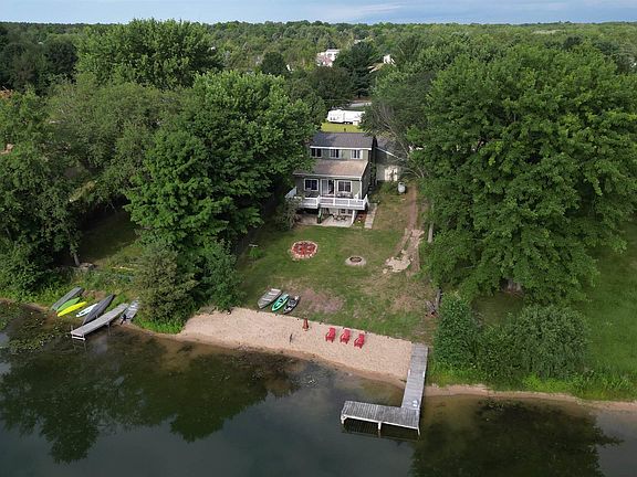 Welcome home to Lake Gitchegumee! Enjoy your very own private sandy bottom lake frontage, dock included, with a charming updated 2 story home and full finished walkout basement. Featuring stunning views from the large open deck updated with composite boards in 2023, and plenty of outdoor space to enjoy. Relax on the sandy beach or around the firepit while enjoying the lake. The oversized 2 car garage offers a pull through for plenty of room for any water toys. Inside you will find a large entry way, open floor plan with panoramic views of the lake, main floor master bedroom and main floor laundry. Large kitchen with island and walk in pantry. The main floor is also equipped with a cozy reading nook, wood burning fireplace and plenty of space for entertaining. Upstairs you will find 3 bedrooms, full bathroom and bonus space to use for storage or extra guests. In the finished lower level you will find a wet bar, full bathroom, storage, and walkout to access a patio area open to the backyard. The roof was replaced in 2021 and new appliances added in 2023. Natural Gas will be in the neighborhood fall 2024. Many furnishings are negotiable! Lake Gitchegumee is a no wake lake with ample wildlife and fantastic fishing. Start enjoying lake life just in time for summer!