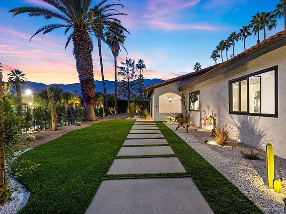 Welcome to your oasis in the highly coveted windfree Los Compadres neighborhood of South Palm Springs! Great short term rental opportunity as the city still allows STR in the neighborhood, well below the cap limits. This professionally designed stunner is just a short stroll from the Prescott Preserve offering the perfect blend of luxury and nature. Imagine waking up to breathtaking views of the Bob Hope Residence and Mountains right from your front yard, and enjoying the serene beauty of the walking trails and equestrian facilities directly across the street.Entertainers paradise richly filled with amenities with no power lines to disrupt your views, you can bask in the tranquility of the desert landscape.Plus, for loan buyers, the land lease has already been extended through 2067, making this a fantastic investment opportunity! This home is ready for you to move in and start living the Palm Springs lifestyle.