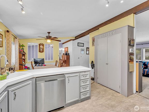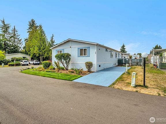 Corner-lot charmer in desirable College Place MHP (all-ages)! Professionally landscaped yard with irrigation system in both lawn & flower beds. The 4-bed layout offers flexible space for guests, office or hobbies. Kitchen with stainless-steel appliances, plus washer & dryer also included. Energy efficient heat pump for year-round comfort. The roof & skylights are only 3 years old. Fully fenced backyard for play, pets or gardening in the raised flower beds. Parking for two vehicles (tandem) at the home. Seller currently rents an additional on-site space for $50/month, can transfer to new owner. Superb location ½ mile to Green River College. Quick access to Hwy 18 & 167, shopping, dining & services. Welcome to College Place!