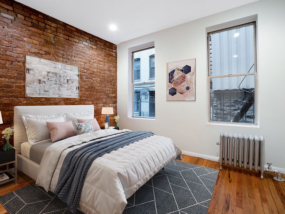 Exposed brickFull-size junior bedroomHigh ceilingsClosets in both bedroomsWood floorsEat-in kitchenQueen-size master bedroom
