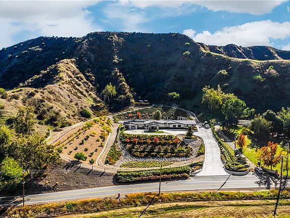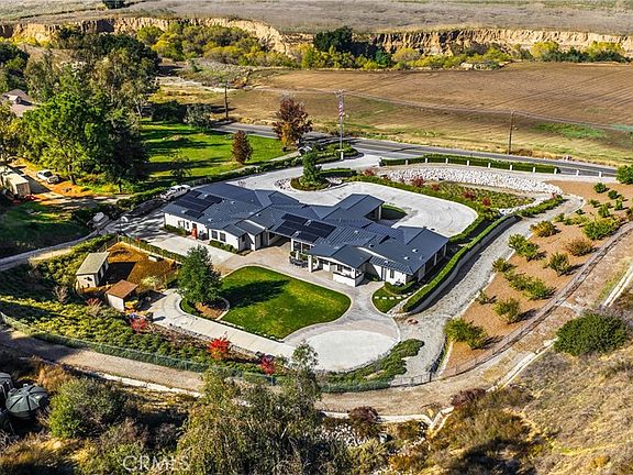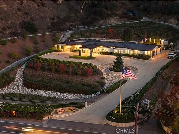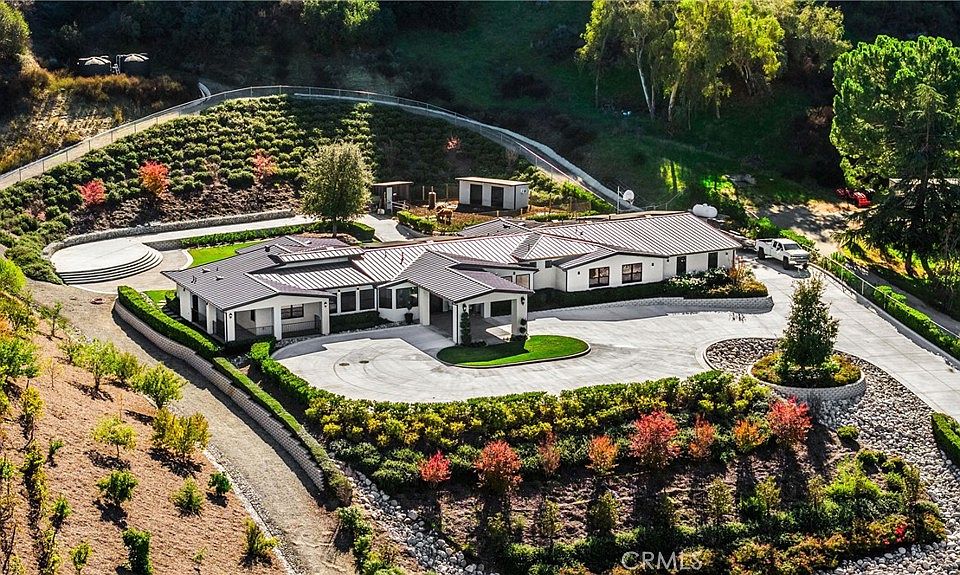 Experience refined luxury living on more than six acres in the highly desirable Live Oak Canyon area of Redlands. Completed in 2020, this custom single story estate offers an elegant blend of modern design, exceptional craftsmanship, and tranquil natural surroundings. High ceilings and an open concept layout create an impressive sense of space, while expansive windows provide beautiful views and seamless indoor outdoor living. The gourmet kitchen features top tier stainless steel appliances, a steam oven, six burner range, built in refrigerator, oversized stone island, and a spacious walk in pantry. The main living areas are enhanced by wide plank flooring, designer chandeliers, and custom cabinetry throughout. Four of the five bedrooms include private ensuite bathrooms and walk in closets. The fifth bedroom is currently used as a beautifully finished office, but can easily be converted back to a full bedroom, making a fantastic fit for a large family. Additional interiors include a dedicated exercise room and a large game and entertainment room complete with a full wet bar. The covered outdoor living area is designed for year round enjoyment and includes a built in barbecue, warming drawer, ice chest, and generous space for dining and relaxation. The grounds are thoughtfully planned for low maintenance and feature more than forty fruit trees, multiple citrus varieties, and grape vines. An additional graded pad on the property offers the potential for a future pool, casita, or workshop. A four car garage, RV parking, a climate controlled storage room, dual HVAC system, and extensive guest parking further elevate the functionality of the estate. No detail has been overlooked, from the fire-retardant metal roof and smooth-finish exterior to the hundreds of thousands invested in premium hardscape and landscape upgrades. A wrap-around driveway effortlessly accommodates 20+ vehicles, while a self-sustained irrigation system supports nearly all 6 acres with remarkable efficiency. Attempting to recreate this custom estate for the same price would be nearly impossible the owner has meticulously curated every inch of this property to deliver an unparalleled living experience. property is private, peaceful, and truly one of a kind, offering an exceptional level of luxury within the beauty of Live Oak Canyon.