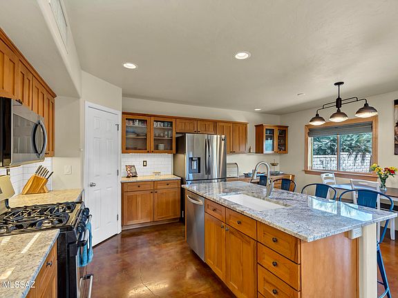 Elegant 4-Bedroom, 3-Bath Desert Sanctuary in a Gated Central Community. Perched on a private lot with serene desert views, this 4-bedroom, 3-bath home perfectly balances sophistication, comfort, and convenience. Located in a highly sought-after gated community with easy access to the Loop, it offers both tranquility and connectivity for modern living. Inside, stained concrete floors and a vaulted wood and viga-beamed ceiling create an open, airy ambiance, enhanced by new windows throughout that fill the home with natural light. The updated chef's kitchen is a centerpiece, showcasing granite countertops, a gas range, upgraded cabinetry with under-cabinet lighting, stainless steel appliances, a step-in pantry, and a center island with breakfast bar seating, perfect for (continued)... entertaining or everyday family life. The great room features soaring ceilings and a gas-start fireplace, creating a warm and inviting gathering space. The family room opens to a covered porch, seamlessly extending indoor living outdoors. Downstairs also offers a bedroom with custom office/desk built-ins and a full bath, ideal for guests or a home office, along with a versatile open area that can serve as a formal dining space or additional living space. Upstairs, the primary suite is a private retreat, complete with a balcony overlooking the greenbelt and mountain vistas. The fully remodeled primary bath boasts a spacious walk-in shower with a bench and multiple showerheads, a new dual vanity, and a cedar-lined closet for ample storage. A loft upstairs provides flexible space for a study, media area, or playroom, accompanied by two additional bedrooms and a full bath with tub/shower. Additional touches include a custom foyer bench and newer Hunter Douglas window coverings throughout. Completing this exceptional home are a 2-car garage, a recently painted exterior, and an included washer and dryer. Ideally situated near shopping, dining, and walking/riding paths along the Loop, this residence embodies modern luxury with classic desert charm.