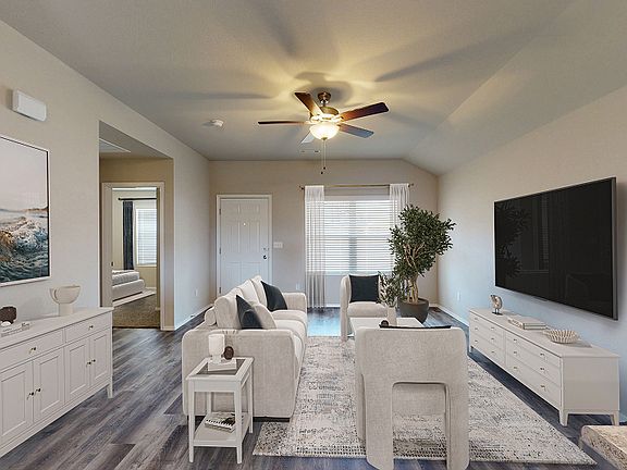 This modern single-story home opens to a welcoming living room with shared access to a fully equipped kitchen, intimate dining area and covered patio, ideal for seamless indoor-outdoor living. Tucked to the side of the kitchen is the owner's suite with an attached bathroom and walk-in closet. Two secondary bedrooms are located at the opposite end of the home to provide peaceful retreats.