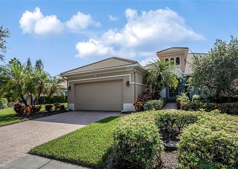 Front Entrance !!! Spectacular Golf Course View of the 5th Fairway, with a large side lot for privacy. 3Br/2Ba. pool villa, Great room floor plan with tray ceilings, sliding glass doors to lanai. Kitchen offers extra cabinetry, granite countertops, stainless appliances, tile backsplash, and seamless corner window. Primary suite offers tray ceilings, wood flooring, sliding glass doors w/ plantation shutters to lanai, separate his/her walk-in closets, separate vanities, large soaking tub & walk-in shower. New LV flooring in third bedroom. Paver deck lanai, heated pool overlooking the Golf Course. Olde Cypress is a low-density gated community with 550 single family homes, located in North Naples, the Social Membership allows residents to use the clubhouse facilities which include club activities, fine & casual dining, tennis, pickleball, swimming pool, fitness and meeting rooms. Residences of the community may enhance their privileges by upgrading to a Golf Membership on the prestigious P.B Dye 18-hole designed course. There is a new Clubhouse renovation taking place that will put Olde Cypress in a class of its own. Olde Cypress is located just off I-75, allowing easy access to Fort Myers airport, numerous restaurants, beaches and shopping