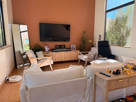 The first floor is open space with high ceiling, good lighting and perfect orientation. It has a living room, family room, dining room and half bath. Wifi, Kitchen usage is included. Second floor is features with a study room, 2 bedrooms and 1 suite. There is outdoor pool and jacuzzi, palm trees.