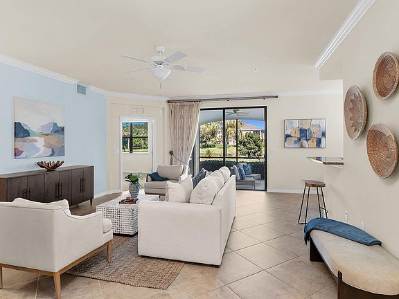 In the Village of Sonoma, enjoy a first-floor end-unit coach home with beautiful lake views in the Sonoma Village. This 3-bedroom residence is elegant and comfortable. The exterior includes a classic tile roof, impact doors and impact windows throughout, lush landscaping and a brick paver driveway leading to the 2-car garage. Inside features include recessed lighting, crown molding, blinds and tile flooring on the diagonal in the living areas. The kitchen is equipped with stainless gas cooking appliances, granite countertops, a tile backsplash, pantry, breakfast bar and a dining area. The formal dining area and the spacious living room. The owner's suite offers tranquil lake views, direct access to the lanai, two walk-in closets and an en-suite bath featuring a dual sink vanity, linen closet, deep soaking tub and a walk-in shower. The two guest bedrooms are located in a separate and private area of the condo. Additional features include a tankless water heater and extra storage closets. The living area overlooks and opens into the covered and oversized screened-in lanai making it a great area to relax or entertain. Capital CDD paid in full. A life of luxury is ensured in this residence enhanced by the 54,000-square-foot club and spa, full-service spa, fitness center complete with personal trainers and fitness classes, 3 swimming pools, championship golf courses, 3 bocce courts, and 6 tennis courts and 10 pickleball courts with competitive teams. Fiddler's Creek is close to Marco Island Executive Airport, beaches, shopping, restaurants, boating and easy access to Naples 5th Avenue.