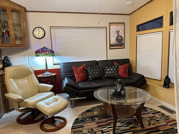 Located in a 55+ Community! This beautiful Park Model is Move-in Ready and Features Vaulted Ceilings, Fully Furnished, has a U-Shaped Kitchen, Wood Cabinets with Built-in Microwave and a New Corner SS Sink & Faucet installed in 2024. Also Installed in 2024 is the New Shower, Sink, Faucet and Fixtures in the Bathroom, Vinyl Planked Floor, 2 Ceiling Fan. New Leather Sofa Sleeper was purchased in 2023. The Bedroom has Mirrored Closet Doors with a Queen Bed, Built-in Overhead Storage Cabinets. The Outdoor Living Space has a Beautifully Paved Patio Area with Patio Furniture. 2022 New Ceiling Fans were installed as well as a New Central A/C & Heat, the Water Heater and Lighting. Casita/Studio has Running Water, Power, A/C, Tile Floor, Fully insulated, Windows, Private Entrance, Small Sink, Furniture and a Full Size W/D Purchased in 2022. Outside Lights were Replaced in 2022. Outside Side Paver Patio & Side Area between Park Model and Studio Added in 2022. All Permits and Inspections were Completed with City and County for Studio as it was being Constructed and Power, Water being Installed.*Some Items Shown May Not Convey. NO PET COMMUNITY! Lot Rent is Displayed as the Monthly Cost and is Due Annually.