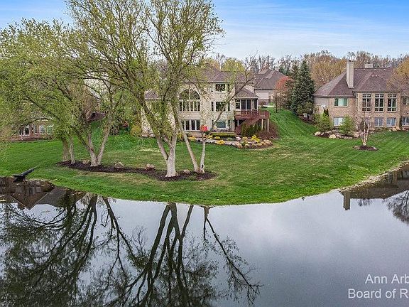 This is one of the premier homes in all of the Travis Pointe Country Club neighborhood. The home rests on a gorgeous lot featuring panoramic waterfront views of a pond and the #2 Hole at TPCC. The setting is special with incredible outdoor living spaces included large paver patio with fire pit, Ipe wood deck, and screened porch. The interior is showpiece of design, materials, and craftsmanship. Highlights include a two story Great Room with wall of glass overlooking the course, open concept Cherry kitchen with granite, formal living and dining rooms, office with built in cabinets and bookshelves, and a luxury main floor primary bedroom suite with Travertine Stone primary bath, and large walk-in closet. The upper level features a 2nd bedroom with a private full bath and 3rd and 4th bedro bedrooms with a shared full bath. The finished walk-out lower level is fantastic featuring large multi-use rec areas, full wet bar, 5th bedroom, 4th full bath, exercise room, and fully conditioned wine cellar. Travis Pointe features 18 hole Championship golf, indoor/outdoor Tennis, indoor/outdoor swimming, exercise, and full dining with Membership. You will love this home!!, Primary Bath, Rec Room: Finished