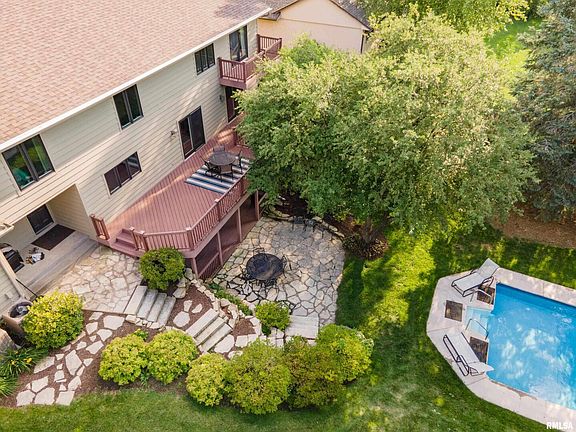 Nestled in Bettendorf's Quail Ridge community, this stunning home offers a perfect blend of aesthetics and convenience. Ideally located just minutes away from Pleasant Valley High School, the trail system, shopping, and North Bettendorf, this prestigious neighborhood boasts a picturesque view with mature trees and beautifully landscaped homes. Sitting on a generous .78-acre lot adorned with mature trees and evergreens, the property provides both space and privacy. The outdoor area features an in-ground pool, deck, covered patio, and flagstone patio, effectively extending the living space. Stepping inside, you'll be greeted by a double door entrance, a grand foyer with vaulted ceilings, beams, and hardwood floors, all complemented by a beautiful staircase. The kitchen has been thoughtfully upgraded by a professional designer, incorporating earth tones to harmonize with the backyard scenery. The upper level comprises three bedrooms and a den, with two staircases for convenient access. The primary bedroom is a private sanctuary with its own fireplace, sitting area, balcony, and ensuite featuring dual sinks, a jetted tub, and more. The basement boasts sliding doors leading to a walk-out patio, a bedroom with an updated private bathroom, and a recreation room--perfect for entertaining, complete with a fireplace with a stone hearth. The garage has 3 stalls, sink, drain, walk- up storage room and more!