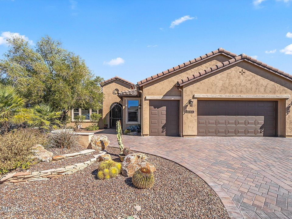 Discover your new desert dwelling in the vibrant 55+ community of SaddleBrooke Ranch! This 2,072 sq. ft. residence features two spacious bedrooms plus a den, and a stunning updated kitchen with custom cabinetry, Granite slab counters, a tiled backsplash & gas cooktop. The corner lot offers views of the golf course and mountains, as it sits near the #10 tee box. Enjoy the low maintenance, professionally landscaped rear yard with a gas fireplace, cactus stone fountain, a full-length covered patio, and a patio grill which is included in the sale. Steps away from the fitness club and tennis courts, making it perfect for an active lifestyle. The 2.5 garage has built-in storage for recreational gear + a golf cart. The golf cart and some furniture & artwork are included in the sale! View this one in your Saddlebrooke Ranch tour!