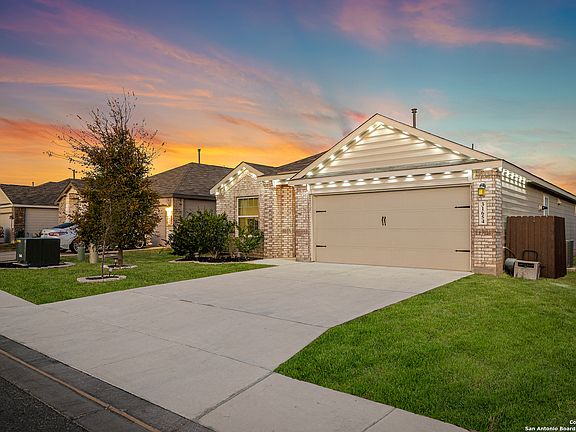 Beautiful 4-bedroom, 2-bath home with a 2-car garage situated on an oversized lot. The inviting front porch opens into a thoughtfully designed floor plan that seamlessly blends comfort and functionality. This home offers two spacious living rooms, providing flexibility for entertainment, work, or relaxation. The kitchen features gas cooking, granite countertops, a generous breakfast bar, and a spacious pantry-ideal for everyday living and hosting. A custom wine bar adds a sophisticated touch and enhances the home's entertainment appeal. Throughout the residence, you'll find upgraded ceiling fans, well-proportioned bedrooms, and excellent closet space. The primary suite is privately positioned away from the secondary bedrooms and includes dual vanities, a large walk-in shower, and an expansive walk-in closet. The backyard is truly exceptional, backing up to a greenbelt for added privacy, and offering a custom patio extension. Whether hosting gatherings or enjoying quiet evenings outdoors, this space provides endless versatility along with abundant yard space. Located in Comal ISD within the desirable Hidden Trails community, residents enjoy access to outstanding neighborhood amenities that elevate everyday living.