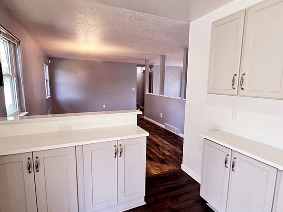 White shaker style cabinetsBackyard oasisBeautiful lotLarge garden bedsFully finished basementQuartz countertopsCovered patio