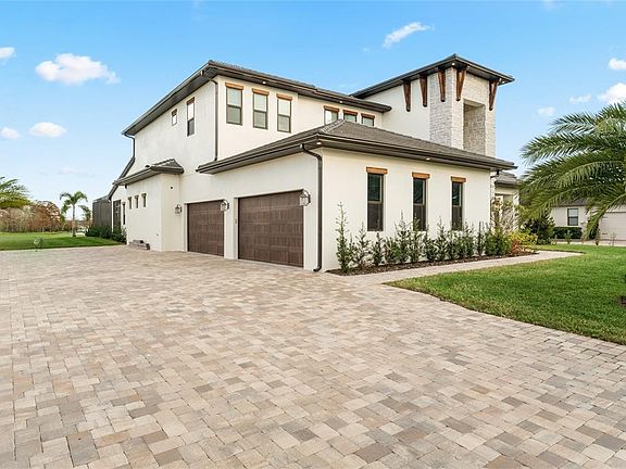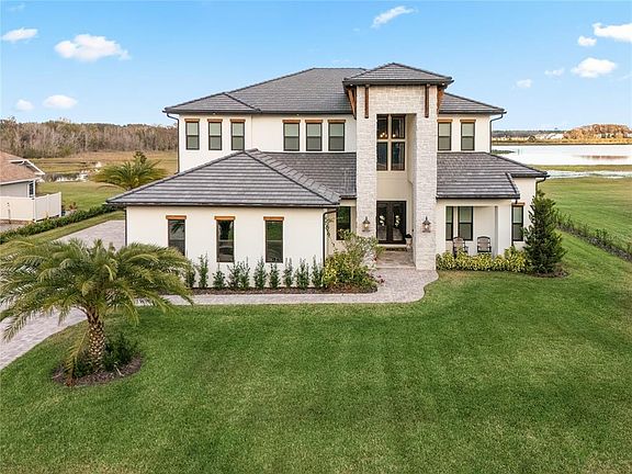 Step into a world of unparalleled luxury with this stunning estate on the shores of Lake Ajay in St. Cloud, Florida. Boasting million-dollar views and a lifestyle to match, this brand-new, 5,820-square-foot home is an oasis of sophistication, comfort, and convenience, just minutes from the world-renowned Lake Nona. This 6-bedroom, 5 full-bath, 2 half-bath home blends cutting-edge design with exceptional craftsmanship. Featuring expansive 12-foot ceilings downstairs and 10-foot ceilings upstairs, the open floor plan welcomes natural light into every corner. Hardwood floors flow throughout the living areas and bedrooms, while the bathrooms feature exquisite luxury tile finishes. The elevator offers seamless access to both levels, providing convenience and enhancing the home's luxurious living experience. Custom cabinetry graces every room, adding elegance and functionality. The chef’s kitchen is a culinary masterpiece, with quartz countertops throughout, a stunning backsplash, and custom kitchen cabinets that provide both beauty and functionality. Equipped with state-of-the-art appliances, including a custom refrigerator and a commercial-grade gas stove, this kitchen is designed to impress the most discerning chefs and entertainers alike. The master suite is a true retreat with breathtaking lake and pool views. Its spa-like en suite includes a stand-alone tub, a walk-in shower, and a massive walk-in closet that’s nothing short of a dream. Just steps away, a wine cellar adorned with white-washed brick creates the perfect setting for your finest collection. The theater room rivals any cinema with its plush seating and stylish décor. Guests will love the additional bedroom with an ensuite on the main floor and the loft and balcony upstairs, offering panoramic views of the sparkling lake and expansive pool area. Outside, the travertine-paved patio includes both an Olympic-sized pool and jacuzzi that provide the perfect backdrop for relaxation or entertainment, all set against the serene lake. This home sits on just under an acre and offers savings on both property taxes and community fees, making this a rare opportunity for high-end buyers seeking both luxury and value. The neighborhood itself is a haven of private amenities, including a private dock, private boat launch, and a full suite of tennis, basketball, and pickleball courts. Built in 2024 with top-of-the-line AC units, tankless water heaters, Appliances, Flooring, Cabinetry , Icynene insulation, and so much more! This home combines modern convenience with energy efficiency.Live the high-end lifestyle without the high-end price tag. Don’t miss out—schedule a tour today and experience everything this breathtaking home has to offer!