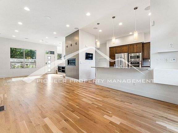 As you enter through the front door of this townhome, you'll immediately notice the beautiful hardwood floors, bright white walls, and tall ceilings. There is a living room and dining nook on the main level, that flows back into the kitchen. The kitchen is fitted with upscale, stainless steel appliances including a French door fridge, gas range, oven, dishwasher, and microwave. There is a TV mounted on the wall for tenant use and a countertop with room for bar stools. There is plenty of closet and pantry space for storage.