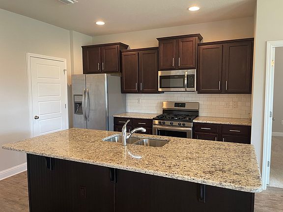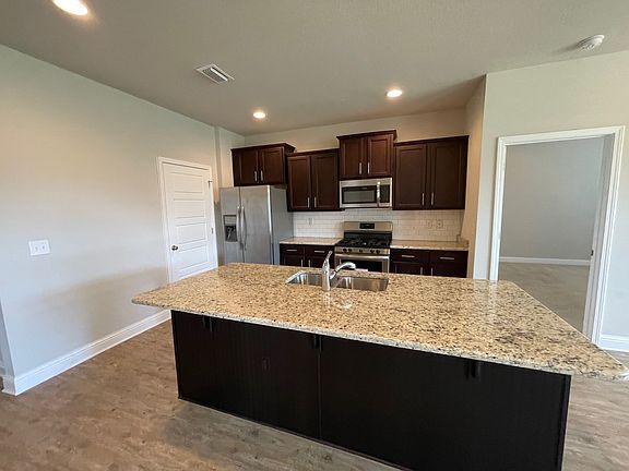3 bedroom, 2 bath open floorplan home within the Stonebridge subdivision. Luxury vinyl planking in kitchen, living, breakfast area, halls, and baths. Carpet in the bedrooms only. Tray ceilings in the living room and primary bedroom. Large primary bedroom with a walk-in closet, and double vanity in the bath as well as a stand-alone shower, garden tub, and private water closet. Spacious kitchen features subway tile backsplash, granite countertops, a large pantry, and an island. Appliances include stainless steel microwave, dishwasher, and gas range. Breakfast area off of kitchen. Washer and dryer hookups. Front and back porch. Fenced in yard. Double garage. Pets approved at owner discretion. $300 refundable pet deposit upon owner approval. (washer/dryer and refrigerator not included). Enjoy Stonebridge's amenities including pools, clubhouse, playground, bocce ball court, tennis courts, and basketball court.