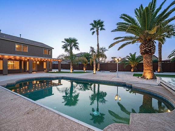 If you're looking for a resort style home, then look no further. This 5 BRs/2.5BA 2,639 sq. ft home with 3 car garage w/epoxy flooring, has a heated pool with a motorized pool cover, putting green, new turf, travertine tile around the pool/sitting area, mature palm/fruit trees, covered patio, RV gate, & expanded concrete RV parking. Inside the home you will enjoy 2 living areas that can be used as a family room/great room or game room. The upscale kitchen offers SS appliances, lots of cabinetry, a pantry, breakfast bar nook w/a bay window. The upstairs boasts a spacious loft & 4 BRs. The oversized owner's suite BA, w/dual sinks, garden tub, separate shower & a walk-in closet. Property is minutes from the town of Queen Creek & Mesa Gateway Airport. Come and see this resort style home