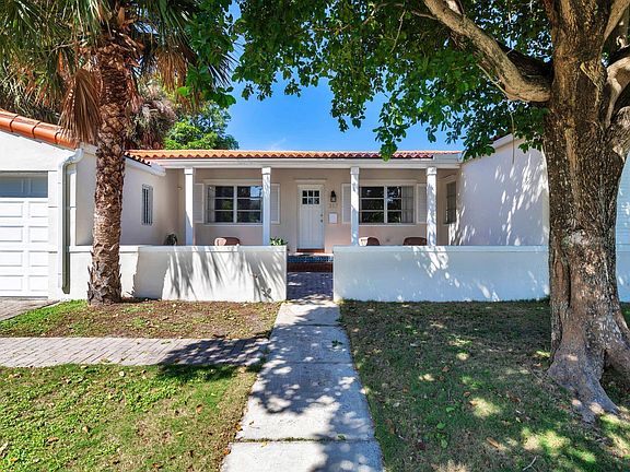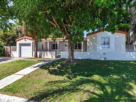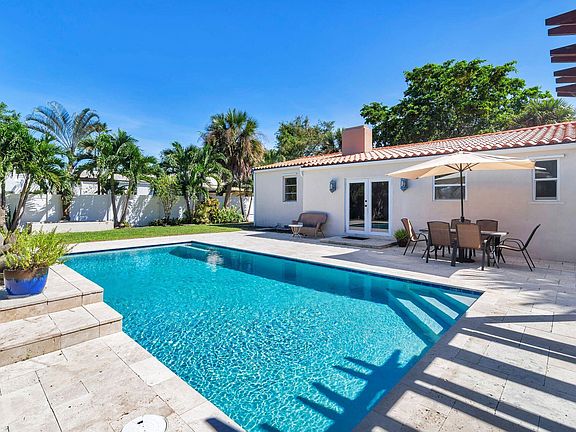 Rare find in desirable Northwood Shores! This 1947, cement block, home offers 2 bedrooms, 2 baths plus a den/nursery/hobby room. When entering the home, you will be greeted by a bright, open 28 X 15 living/dining/family area with vaulted cypress ceilings, original tongue and grove hardwood floors and brick fireplace. The bathrooms have been tastefully renovated and the spacious kitchen has been updated with wood cabinets, granite countertops, stainless steel appliances, 5-burner gas stove, tile flooring and impact french doors leading to the spacious fenced in backyard. The kitchen also has a rare, original corner brick fireplace. The current owner added an amazing 30 X 15 pool in 2018 with Travertine decking and a sturdy, attractive gazebo with an attached natural gas grill. Additional upgrades include a newer 2 zone HVAC and natural gas, tankless water heater. The one car garage, driveway and additional street parking provide great parking for friends, and family. Close to North Flagler Drive, Intracoastal Waterway, downtown and PBI. Please make an appointment to see this special property in one of the most sought-after areas in West Palm Beach. Photos are virtually staged.