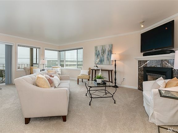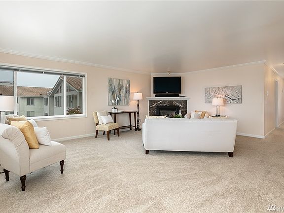 Spacious unit located in the heart of Edmonds with wide views of Sunsets, Ferries, Puget Sound & the Olympics. Kitchen w/ granite counters, Stainless appliances, light maple cabinetry, Gas fireplace, end unit, and deck for summer enjoyment. Sizable Master w/ walk-in-closet & bath. Freshly painted & new carpeting. Unique, private 3rd bedroom & 3/4 bath perfect for studio or home office. Smaller complex w/ 9 units. Secure lobby, garage & elevator. HOA guest room & 1/2 bath can be reserved.