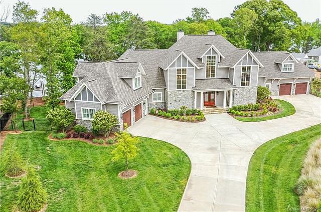Custom waterfront home plan KDH Residential Design. Built by McSpadden Custom Homes. Deep water homesite with natural beach, wide lake views. Flat and wide open homesite with 285 feet of shoreline that is dockable for custom dock and pier. Cul-de-sac location. Beautiful mature hardwood trees dot the shoreline and frame the home with an east facing view. Custom home features real stone, open floor plan, elegant finishes, large covered porches with open terrace to enjoy the stunning lake views.