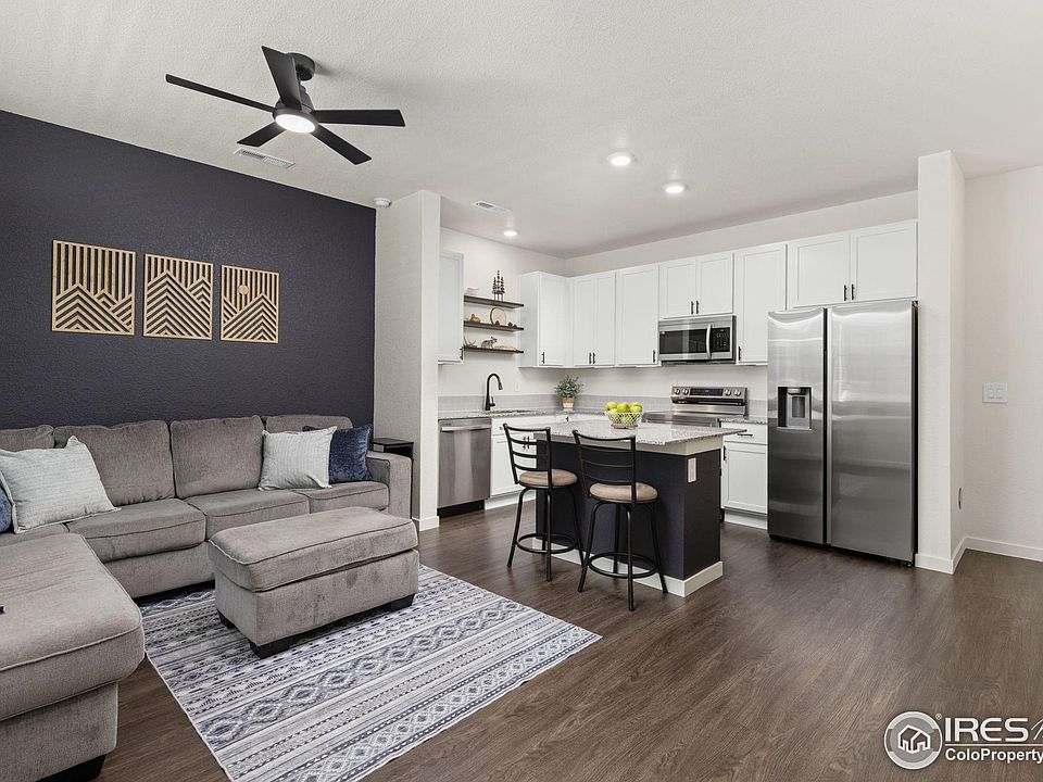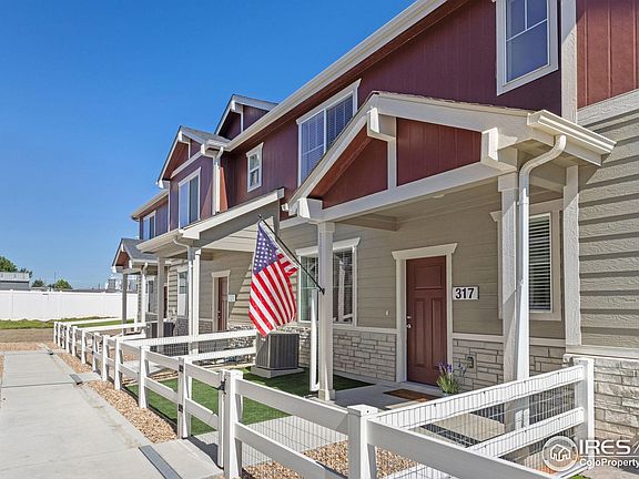 Now is the time to become a Colorado homeowner! This incredible townhome features an open and modern kitchen, dining, and living space, two upstairs bedrooms, each with their own bathroom and walk-in closet, an ATTACHED 2 car garage and the low monthly payment AND low maintenance living you've been looking for. This ideal floorplan is complete with upstairs stacked laundry, a half bath just off the garage and a convenient pantry/coat closet. Finished with flawless, dark luxury vinyl flooring, contrasting sleek, white cabinets throughout, bold charcoal accent walls and kitchen island, upgraded stainless appliances, floating kitchen shelves, tile backsplash, quartz countertops, ceiling fans and additional storage shelving in both upstairs bathrooms. All appliances are included and the 455 sq ft heated garage has already been upgraded with incredible lighting, epoxy flooring and bright white finished walls. Enjoy the covered front concrete porch with easy to clean turf and fenced area for your four legged friends. You'll be just minutes to the small town fun Johnstown offers and just steps from the YMCA, library and skate park. This lovely townhome has been very lightly lived in for only two years, has a low HOA of just $100/month, NO Metro tax, a quiet, safe location and just might just check all the boxes. Schedule your showing today!