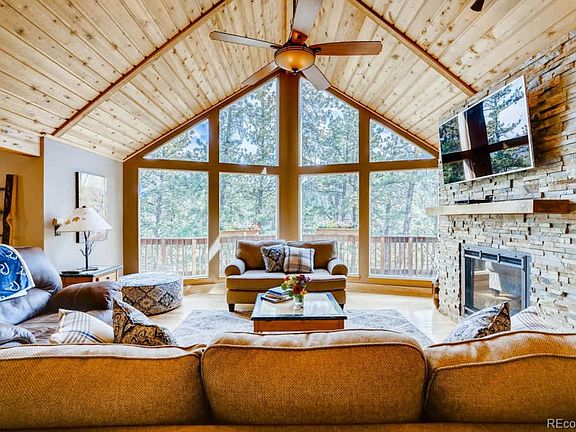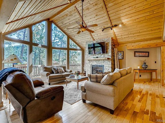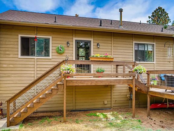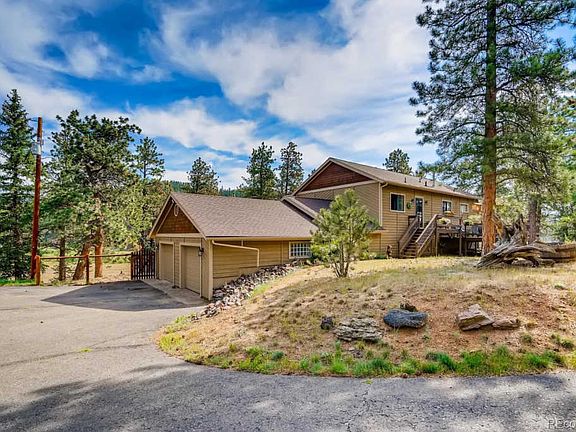 Welcome home to the quiet serenity of mountain top living with breathtaking mountain views & the sunrise over the Colorado Rockies. This beautiful Ranch style home is nestled in 4.5 private acres and has a desired open floor plan and MAIN LEVEL LIVING! Large, open rooms with plenty of windows. Gorgeous living room with cathedral ceiling, a wall of windows and a stunning stone surrounded gas fireplace. Home features over 3,000 sq ft with 4 beds (3 on lower level and main level master suite with vaulted ceilings, walk-in closets and deck access with a hot tub), 3 baths (master beautifully remodeled with glass walk-in shower & two single vanities, ½ on main floor and remodeled full bath on lower level) plus a 3-car garage. Amazing kitchen with granite counters, beautiful backsplash, new SS appliances, gas cooktop and lots of cabinets. Lower level offers a light & bright family room with a cozy pellet fireplace. Very very private setting. Backs to Deer Creek and a large meadow area. Property is accessed by a paved road that is county-maintained. Paved circle driveway. Lots of room for your outdoor toys too! Four wheeler with snow plow comes as a bonus! Within an hour commute of Denver, this mountain home can be yours to enjoy!