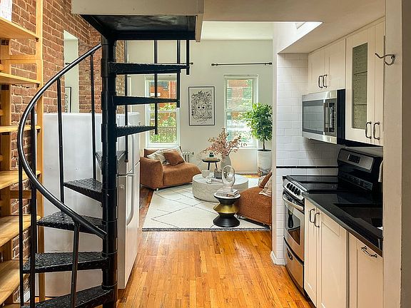 Charming and truly unique one-bedroom apartment with southern and eastern exposures, ideally situated in the heart of the Upper East Side. This bright and airy home features a skylight, high ceilings, exposed brick, and a decorative fireplace that adds character and warmth. The bedroom comfortably fits a full-size bed and the bathroom includes a window for natural light and ventilation. A spiral staircase leads to a standing loft, perfect for a home office, or extra storage. The renovated open kitchen includes a dishwasher and blends seamlessly into the living area.