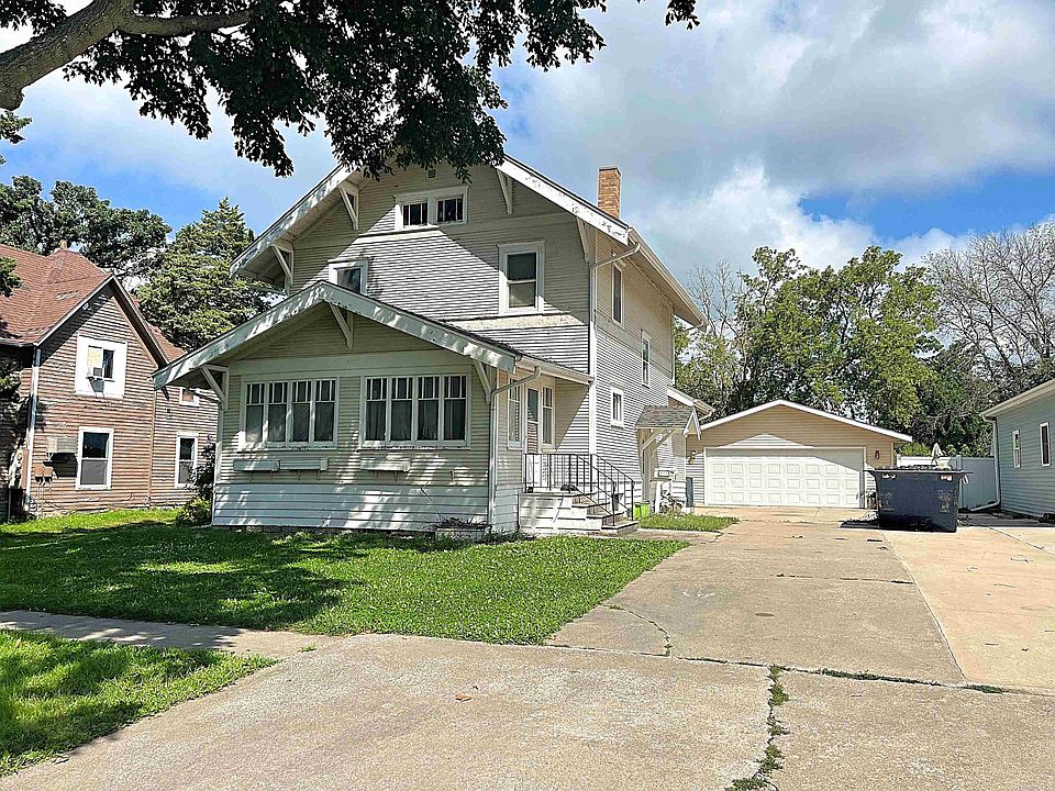 This inviting two-story home offers 3 bedrooms, 1 bathroom, and is situated on a spacious lot just minutes from downtown. A newer two-car garage provides ample space for vehicles or storage. Inside, the main level features a fully equipped kitchen with included appliances, a formal dining room, a cozy living room, and a large front porch perfect for relaxing. Upstairs, you'll find three comfortable bedrooms, a full bath, and the laundry. The walk-up attic offers generous storage or the potential to be finished for additional living space. Hardwood floors run throughout the living room, dining room, stairway, and two of the bedrooms, adding warmth and character. Full of charm and functionality, this home combines comfort, convenience, and room to grow—all in an ideal location.