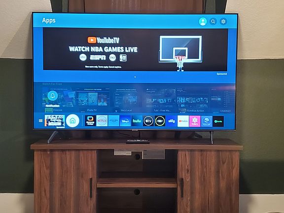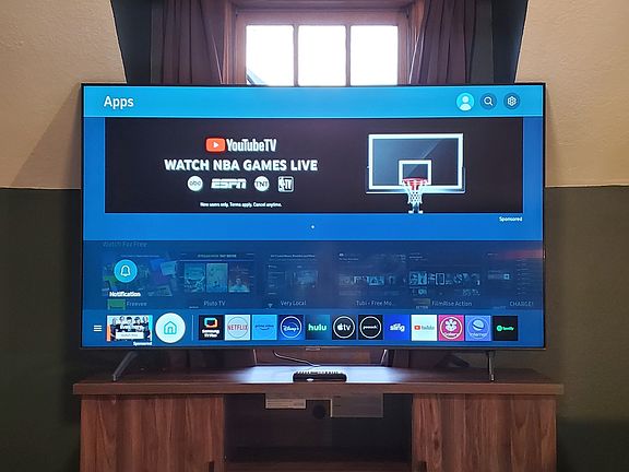 Comfortable living space with 65" smart TV and sofa bed for guests