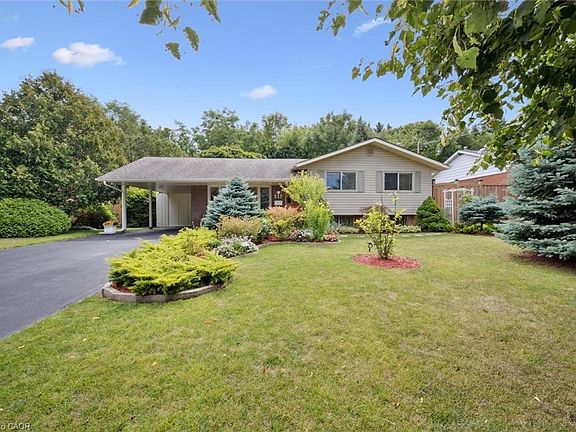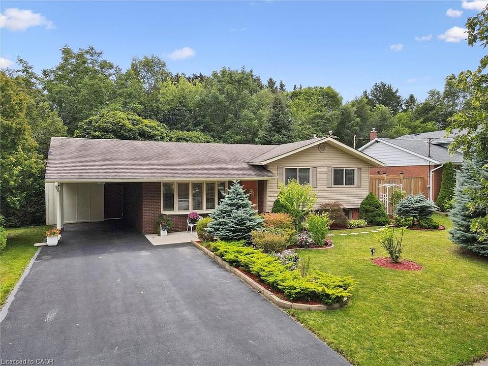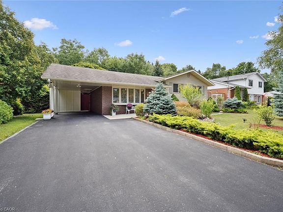 Modern Fully Renovated Side-Split with Creek Access! Welcome to this beautifully updated, carpet-free side-split that perfectly blends style, comfort, and functionality. The modern kitchen features stainless steel appliances, sleek finishes, and a clean, contemporary design that mirrors the quality throughout the home. You'll find engineered hardwood flooring on the main levels, a marble-tiled front entry with a medallion accent, crown moulding, pot lights, dimmable lighting, and a sensor-lit bathroom upstairs. The living room impresses with a custom ceiling design and built-in space for hidden TV wiring above the fireplace. Downstairs, the fully finished basement features durable luxury vinyl click flooring, making it both stylish and practical. Step outside to a massive backyard full of perennials/evergreens, a spacious deck, a shed, and built-in storage for garbage bins. Backing onto a beautiful creek with direct access, this property offers a rare combination of privacy and natural beauty. Parking for 5 with a carport and 4 driveway spots, and located close to highways, schools, and shopping — this home is a must-see!