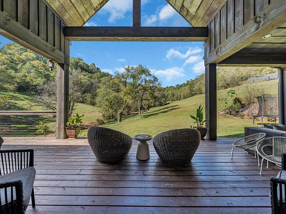 Additional upgrades include wood floors and trim reclaimed from a 100-year-old barn on the property, a whole-house water filtration system, Cat 6 wiring, fiber internet, four HVAC systems, spray foam insulation, and app-controlled smart lighting and thermostats. The home is secured with cameras and monitoring inside and out.