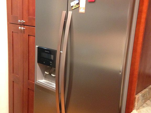 Modern kitchen with granite cabinets & stainless steel appliances.